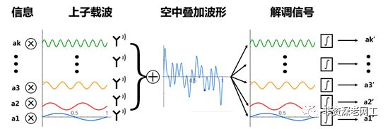 下图的解释更加清晰,可以看到不同的子载波有不同的频率,振幅,和相位,在空中叠加的波形似乎也没有规律,但是信号的接收方可以通过解调制来还原子载波的信号。