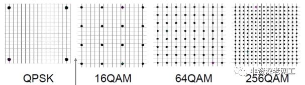 不同相位,不同振幅,不同频率的波,会在QAM的星座图上的不同位置落下一个点,这个点叫做QAM Symbol。每个Symbol表示若干个比特。比如16QAM可以在星座图上落下16个Symbol,每个Symbol可以表示4个比特。
