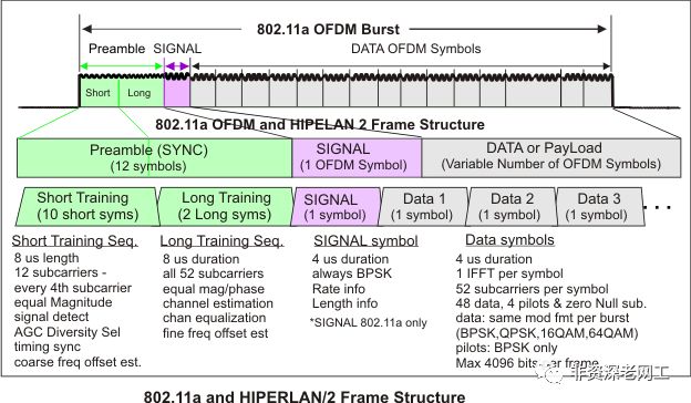 接下来我们来看看OFDM的帧结构。OFDM(Orthogonal Frequency Division Multiplexing)即正交频分复用技术,是从802.11a开始采用的调制模式。给大家看OFDM的帧结构的目的,是让大家知道OFDM Symbol这个概念。OFDM Symbol和QAM Symbol的概念不同,它指的是波的单位传输时间。在802.11a的帧结构中,前导码的Short Training持续时间8us,Long Training部分持续时间也是8us,DATA部分是以4us的持续时间为单位进行传输的。如果能够协商到更高的PHY速率,使用更多的空间流,就可以在OFDM Symbol的持续时间内传输更多的数据,吞吐量自然就更高了。