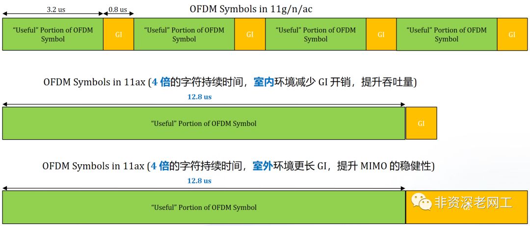 理解了OFDM Symbol的概念,大家就可以理解“无线射频资源实际上是时间片的资源”。11a/g/n/ac的OFDM Symbol持续时间都是4us,其中3.2us用来传输“有用的”数据,0.8us是GI。总体的开销比较大。而11ax的OFDM Symbol持续时间更长,可以用12.8us传输有用的数据,是11a/g/n/ac的4倍。因此在室内环境,可以节省3/4的GI开销,提升吞吐量。在车间/仓库/室外环境,可以使用4倍长度的GI,提升MIMO的稳健性。