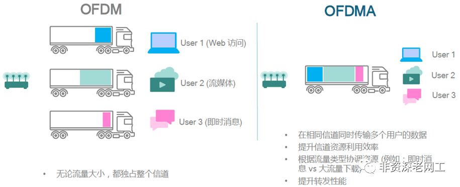 举个形象的例子,在OFDM系统中,每个STA无论流量大小,需要使用多少个子载波,都独占整个信道。就好比它只需要运输少量的货物,却独占了整个集装箱卡车。而OFDMA系统可以将子载波分配给多个STA,就好比利用1台集装箱卡车同时运输多个客户的货物,因此可以有效的提高信道资源利用效率,提升转发性能。