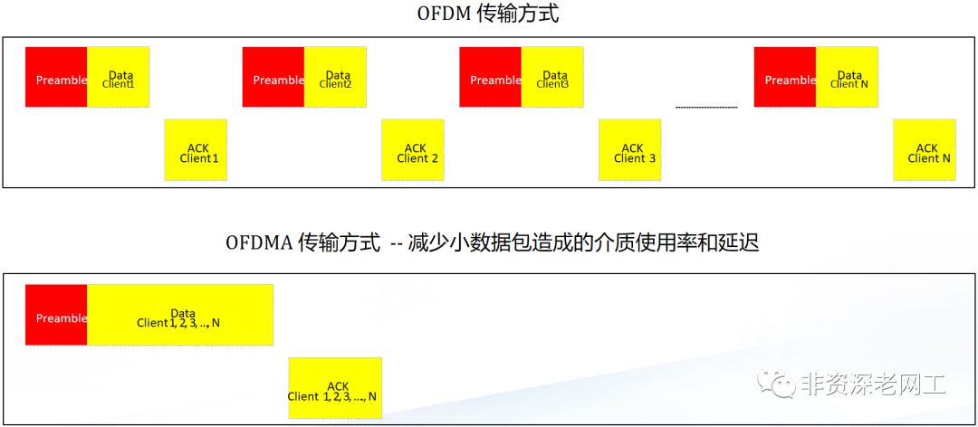 我们知道国家正在发展工业互联网,会有大量的物联网应用。IoT设备的流量类型就是文本消息,网络内也会存在大量的即时通讯的应用,例如微信,同样是体积很小的流量。如果是采用OFDM调制,在处理这类流量的时候难免会存在大量的损耗,而OFDMA就可以利用很小的子载波集将这些流量打包发送出去,再统一接收ACK应答,由此而产生的前导码和GI损耗会少很多。