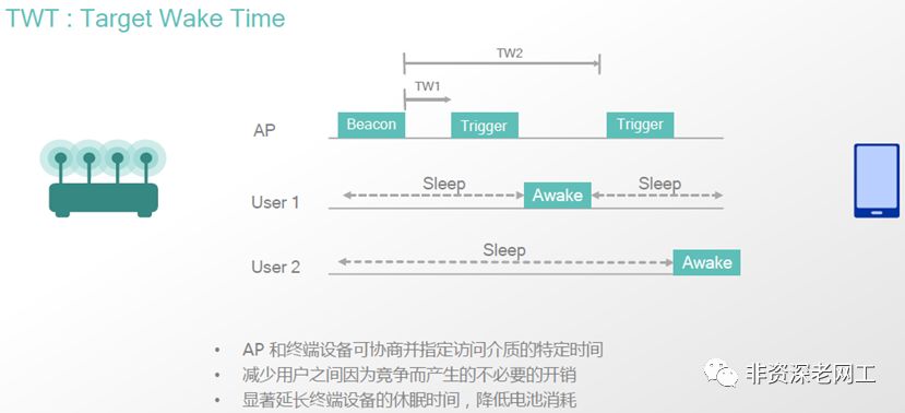 802.11ax AP可以和关联其上的STA协商一个计时器,称为目标唤醒时间(TWT)。AP会维护所有STA的TWT计时器,并避免重叠。STA在自身的TWT来临之前会进入睡眠状态,不再参与信道资源的竞争。而AP会在合适的时间分别向不同的STA发送Trigger报文,将STA唤醒。活动时间结束之后,该STA会再次进入睡眠状态,而AP则向下一台STA发送Trigger报文。