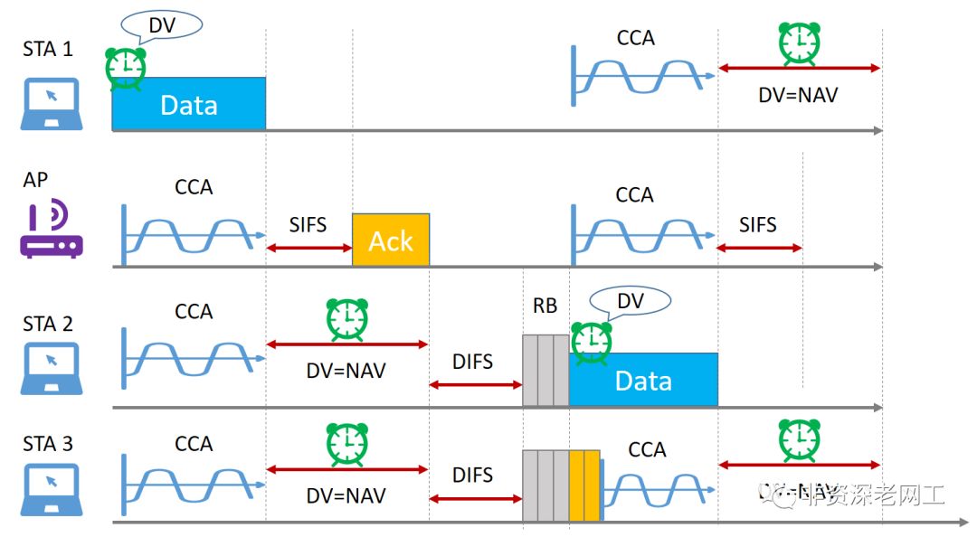 STA1在开始发送数据之前,会广播一个DV(Distance Vector)计时器,通知其他STA:在我的Data传输完成之后,你们都必须等待DV计时器结束之后才能发起竞争