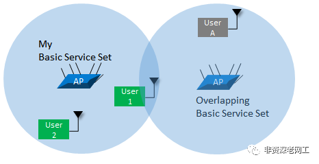 上图绿色的User1和User2关联到左边的BSS,灰色的UserA关联到右边的BSS。左右2台AP的信道相同并且覆盖区域发生了重叠,则产生了重叠服务区 (OBSS, overlapping BSS) ,也就是所谓的同频干扰。