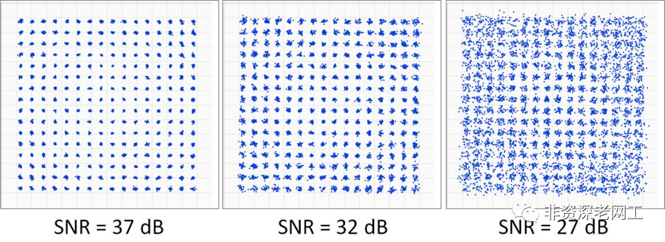 最后,QAM越大,频宽越大,对于信噪比的要求也更高。以256QAM 为例,下图是信号在不同SNR环境中的星座图,可以看到在信噪比为27dB的时候,信号已经无法被解调了。在家庭环境,也许160MHz的频宽和1024QAM可以被应用,但是在办公和商业场所基本上无法使用,除非工信部再开放更多的信道资源给Wi-Fi。