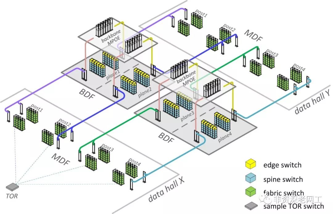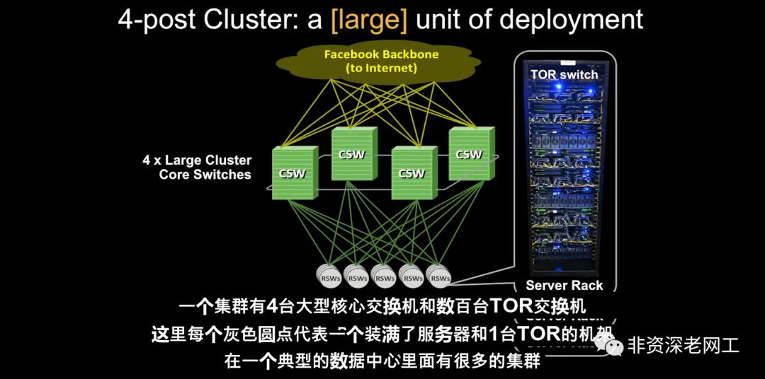 上图就是Facebook在2014年之前使用的,国内现在还在使用的Cluster架构图,在一个IDC里面放4台8个业务槽或者16个业务槽的大核心,连接100多台甚至是数百台TOR。即使升级到25G/100G架构也还是这样的部署方式。
