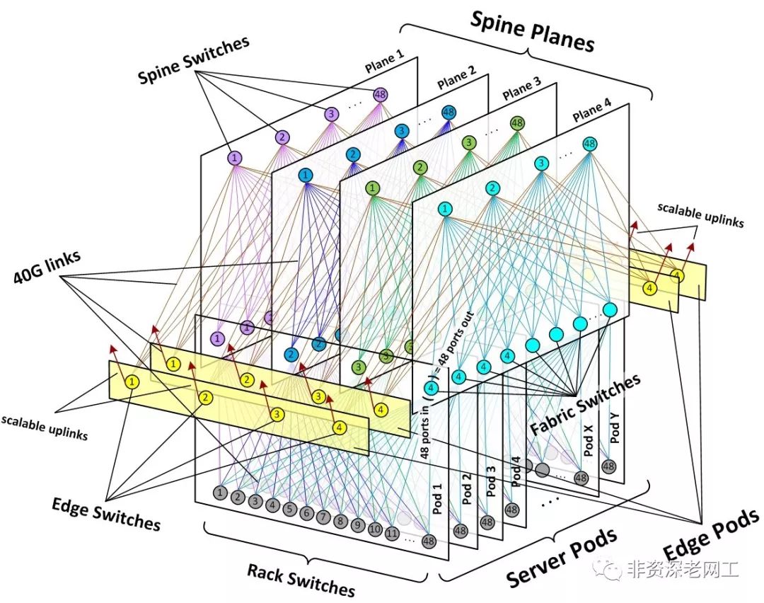 Fabric架构的创新是提出了Spine平面来提供Pod之间的东西向流量转发。一共有4个各自独立的Spine Plane,每一个Plane的核心层一般是48台Spine Switch,接入层是Fabric Switch。可以根据数据中心的规模进行横向扩展。
