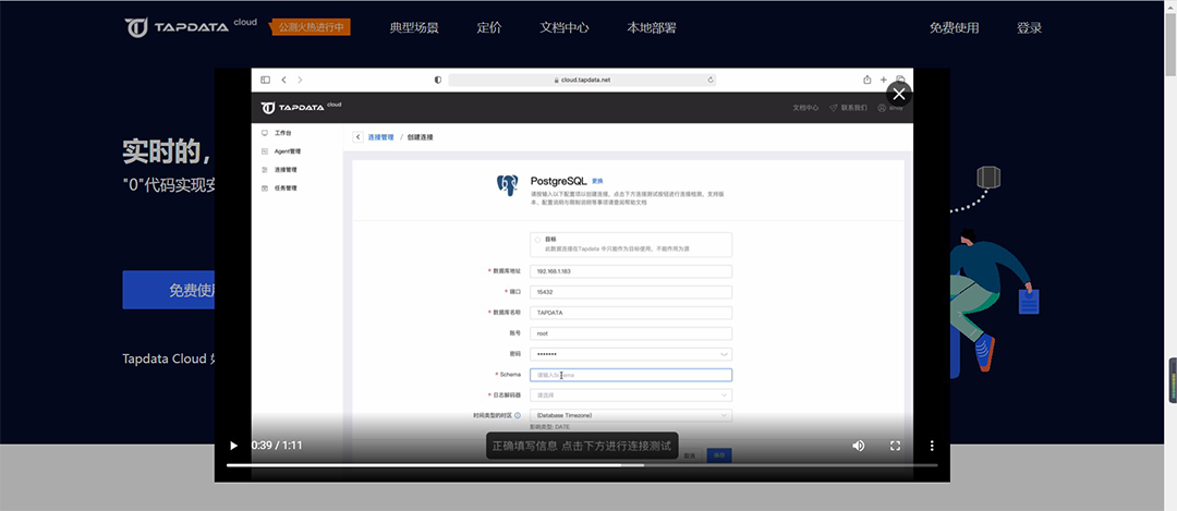 Tapdata Cloud 首页,点击即可观看操作视频