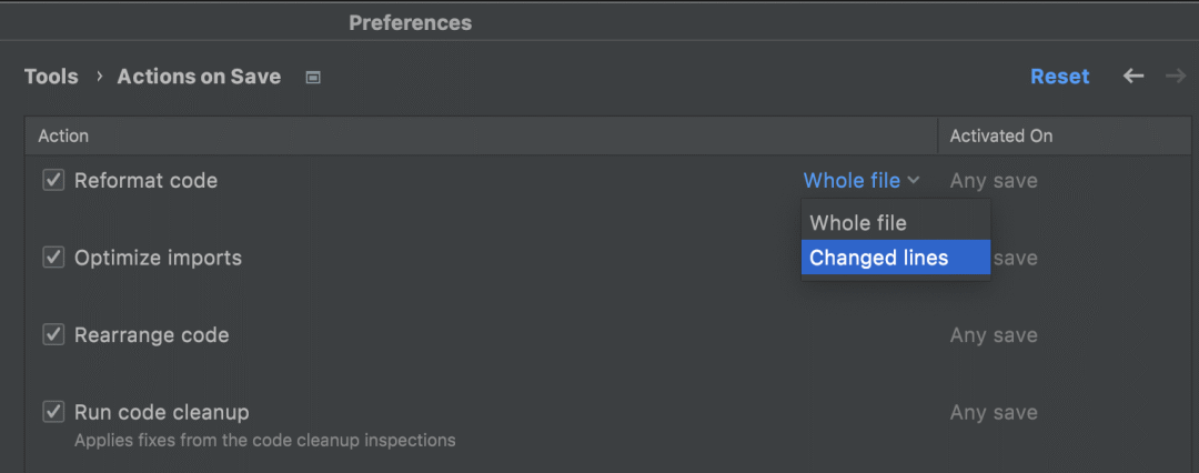 比如上图这个格式化代码,如果设置成 Changed lines,IDEA 自动保存时将会格式化你当前改动代码,这就不用担心写完代码忘记格式化了。