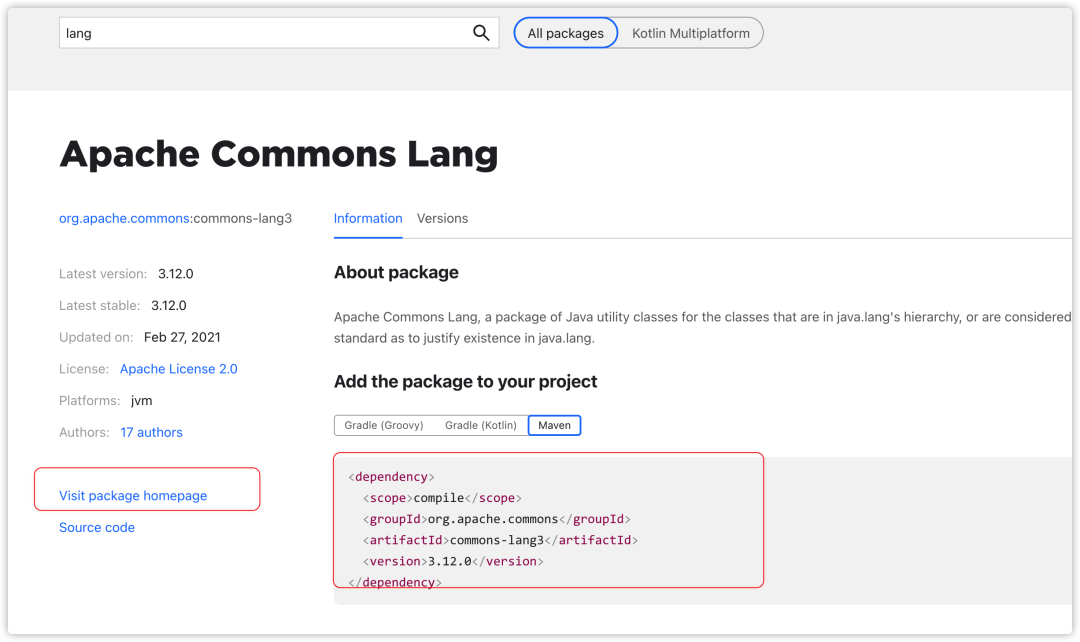 在这个网站搜索了一下 Apache Commons 依赖,可以看到搜索结果不仅包括了 maven pom 依赖,另外我们还可以在左侧直接访问这个依赖的自家的主页,查找使用信息。