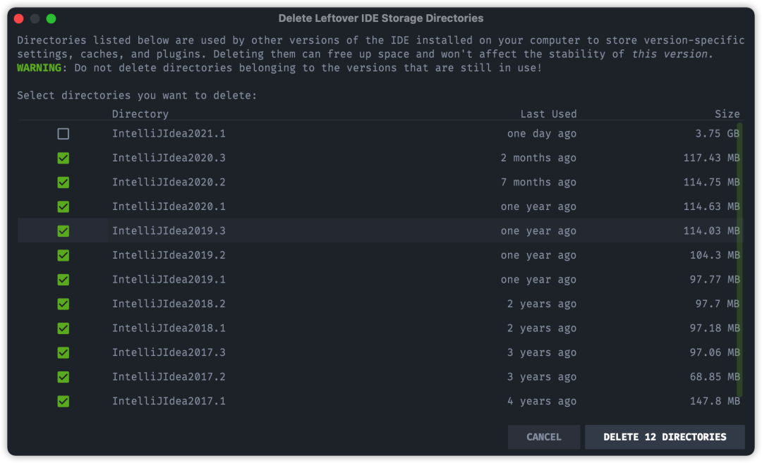 IDEA 2021.2 增加一个自动清理的缓存以及日志的的功能,目前将会自动清理更新已超过 180 天的所有缓存和日志目录。这个清理不会影响系统设置和插件目录。