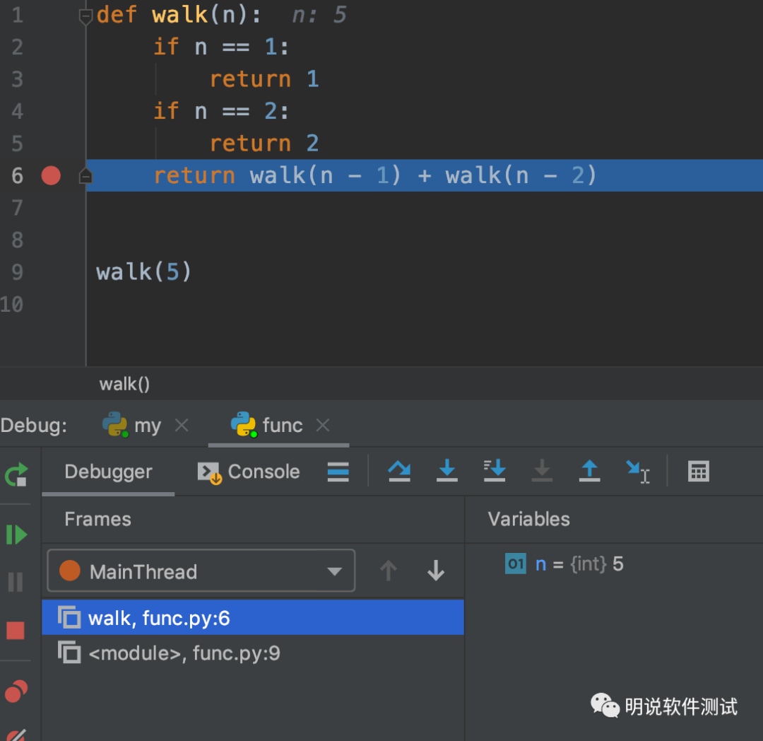 可以通过Pycharm工具查看调用栈的情况。在递归公式那行代码上添加断点,不断执行Step Over,可以看到Frames窗口中的栈信息会不断增加和减少,当调用一次函数会增加一帧,当调用返回后会减少一帧。最后返回第一层栈func.py。前面说的堆栈溢出的风险,体现在Frames窗口中的栈帧太多了。
