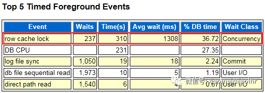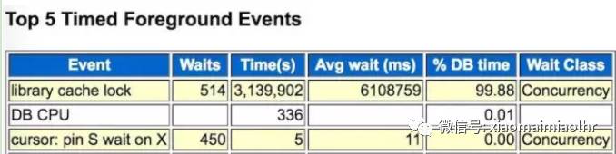 当出现这类问题时,非常典型的AWR报告呈现如下。首先在TOP 5中,可能会看到显著的library cache lock的等待,以下范例来自Oracle 11.2.0.3版本的真实情况: