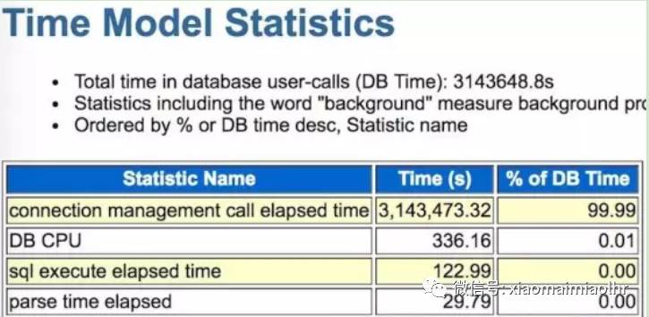 在这类情况下,时间模型(Time Model Statistics)中会显示如下指标,其中,“connection management call elapsed time”占据了主要的DB Time,这个等待直接表明是在建立数据库连接时产生的: