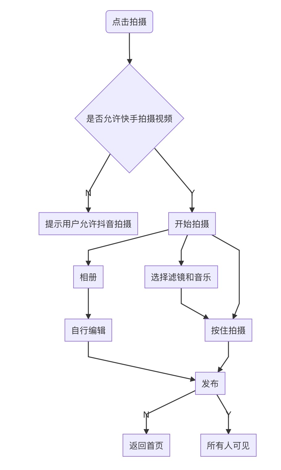 graph TB%% 快手发布视频流程B(点击拍摄) --> C{是否允许快手拍摄视频}C-->|N|D[提示用户允许抖音拍摄]C-->|Y|E[开始拍摄]E-->F[相册]-->G[自行编辑]-->H[发布]E-->I[选择滤镜和音乐]-->J[按住拍摄]-->HE-->JH-->|N|K[返回首页]H-->|Y|L[所有人可见]