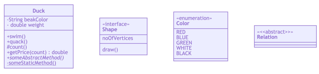 classDiagramclass Duck{-String beakColor- double weight+swim()+quack()#count()+getPrice(count) double+someAbstractMethod() *-someStaticMethod() $}class Shape{%% This whole line is a comment classDiagram class Shape <<interface>><<interface>>noOfVerticesdraw()}class Color{<<enumeration>>REDBLUEGREENWHITEBLACK}class Relation{<<<<abstract>>>>}