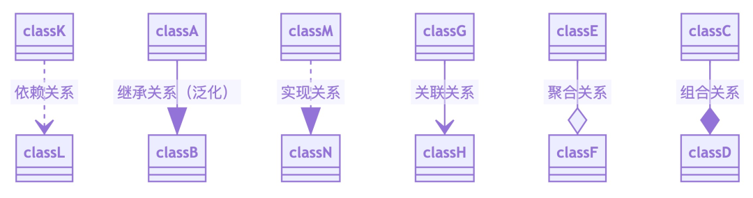 classDiagramclassK ..> classL : 依赖关系classA --|> classB : 继承关系(泛化)classM ..|> classN : 实现关系classG --> classH : 关联关系classE --o classF : 聚合关系classC --* classD : 组合关系