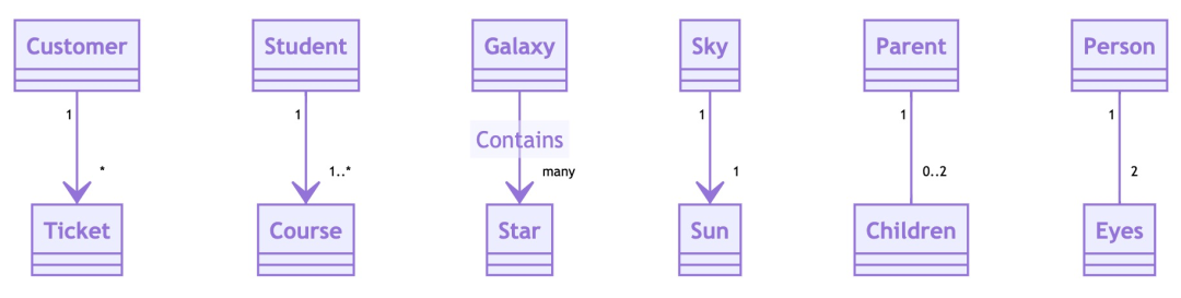 classDiagramCustomer "1" --> "*" TicketStudent "1" --> "1..*" CourseGalaxy --> "many" Star : ContainsSky "1"--> "1" SunParent "1" -- "0..2" ChildrenPerson "1" -- "2" Eyes