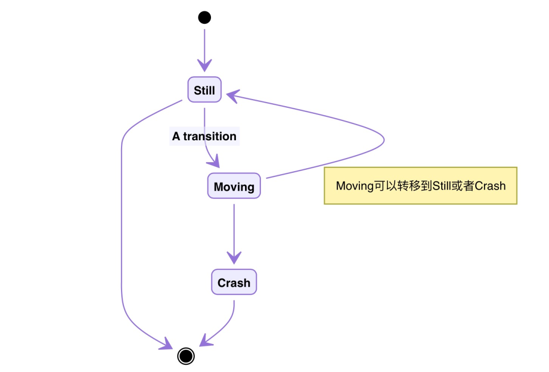 stateDiagram%% 单程生命周期起点是实心圆,终点是同心圆,内圆为实心。%%这个例子包含是3个状态Still, Moving 和 Crash. 从Still状态可以转移到Moving,从Moving可以转移到Still 或者 Crash。不能从Still转移到Crash[*] --> StillStill --> [*]Still --> Moving: A transitionnote right of MovingMoving可以转移到Still或者Crashend noteMoving --> StillMoving --> CrashCrash --> [*]