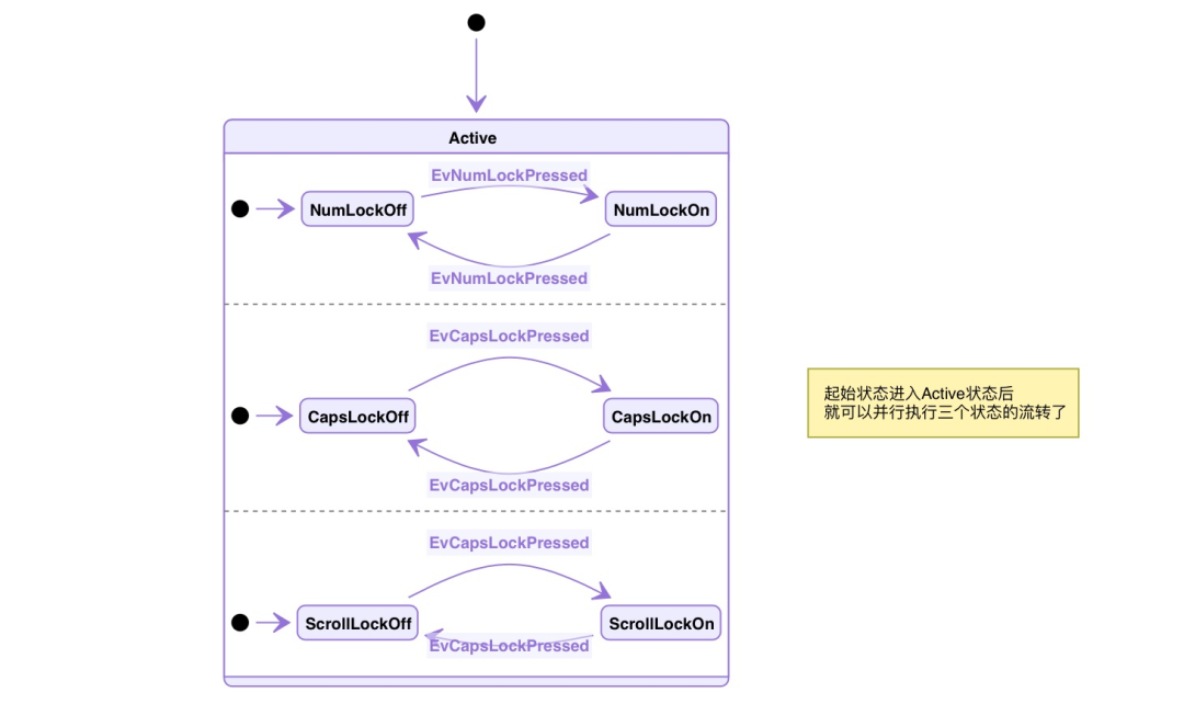 stateDiagram[*] --> Activenote right of Active起始状态进入Active状态后就可以并行执行三个状态的流转了end notestate Active {[*] --> NumLockOffNumLockOff --> NumLockOn : EvNumLockPressedNumLockOn --> NumLockOff : EvNumLockPressed--[*] --> CapsLockOffCapsLockOff --> CapsLockOn : EvCapsLockPressedCapsLockOn --> CapsLockOff : EvCapsLockPressed--[*] --> ScrollLockOffScrollLockOff --> ScrollLockOn : EvCapsLockPressedScrollLockOn --> ScrollLockOff : EvCapsLockPressed}