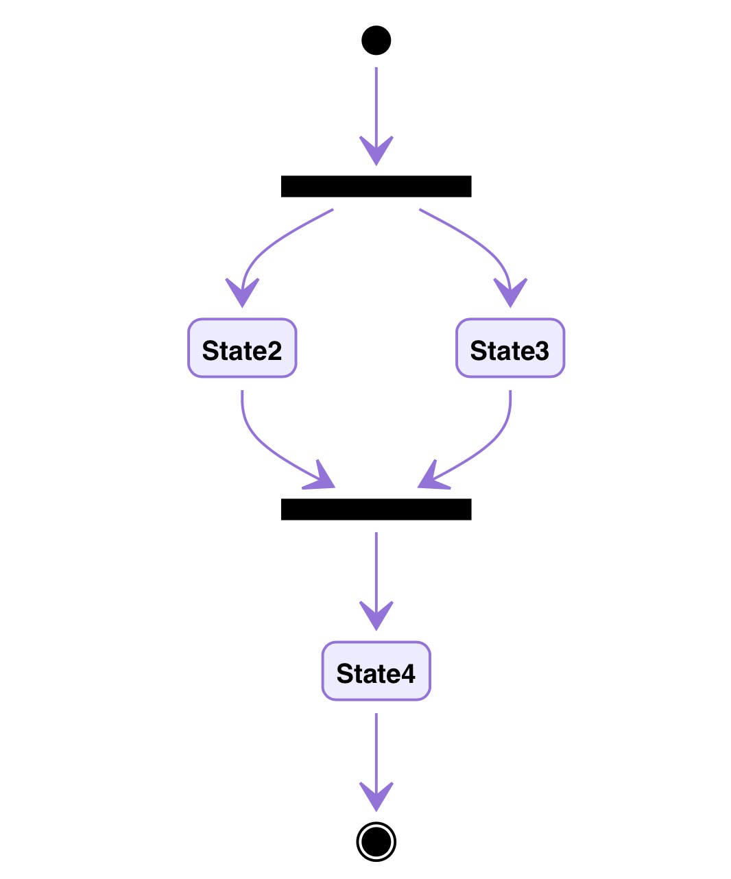 stateDiagram%% state fork_state <<fork>>声明一个statestate fork_state <<fork>>[*] --> fork_statefork_state --> State2fork_state --> State3state join_state <<join>>State2 --> join_stateState3 --> join_statejoin_state --> State4State4 --> [*]