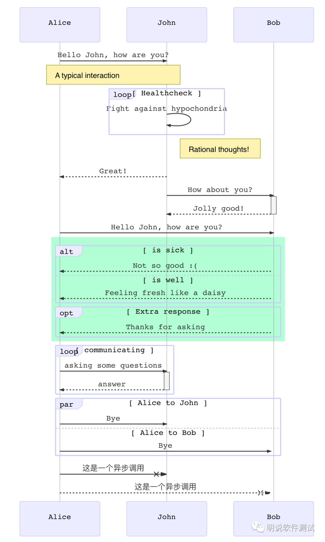```mermaidsequenceDiagramtitle: 时序图例子Alice->>Alice: 自言自语Alice->>John: Hello John, how are you?%% over 可用于单独一个角色上,也可以用于相邻两个角色间:Note over Alice,John: A typical interaction%% loop 后跟循环体说明文字loop HealthcheckJohn->>John: Fight against hypochondriaendNote right of John: Rational thoughts!John-->>Alice: Great!John->>Bob: How about you?%% 控制焦点:用来表示时序图中对象执行某个操作的一段时间%% activate 角色名 表示激活控制焦点activate BobBob-->>John: Jolly good!%% deactivate 角色名 表示控制焦点结束deactivate BobAlice->>+Bob: Hello John, how are you?rect rgb(175, 255, 212)alt is sickBob-->>Alice: Not so good :(else is wellBob-->>Alice: Feeling fresh like a daisyendopt Extra responseBob-->>Alice: Thanks for askingendendloop communicatingAlice->>+John: asking some questionsJohn-->>-Alice: answerendpar Alice to JohnAlice->>John: Byeand Alice to BobAlice->>Bob: ByeendAlice-xJohn: 这是一个异步调用Alice--xBob: 这是一个异步调用```