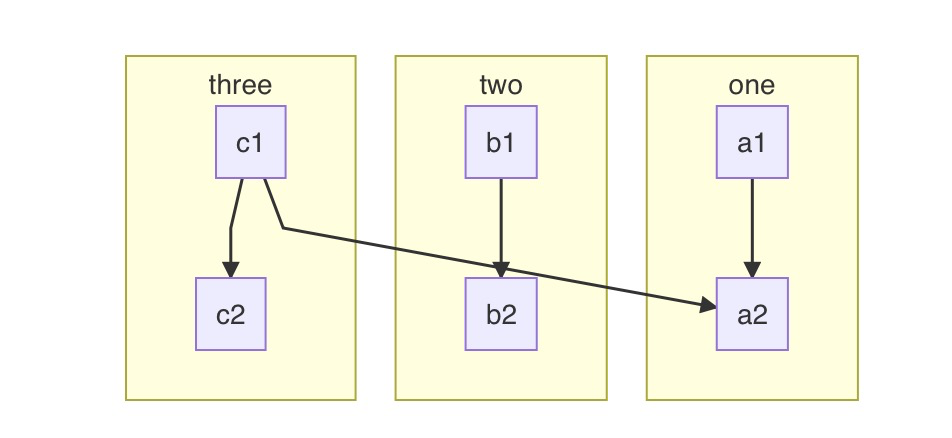 graph TB%% 子流程c1-->a2subgraph onea1-->a2endsubgraph twob1-->b2endsubgraph threec1-->c2end