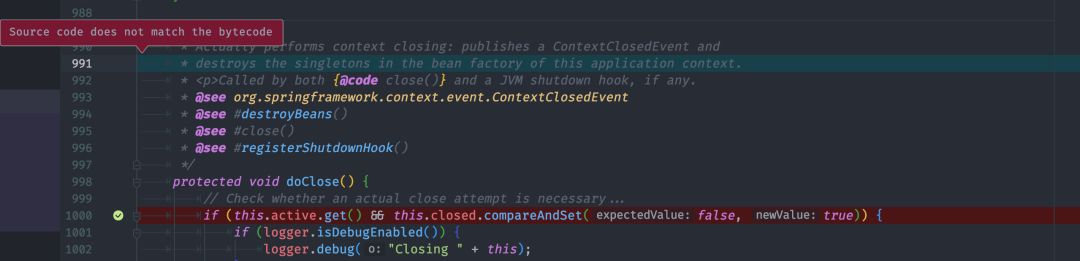 当 IDEA 进入 spring-core 断点时,打开 spring-context 任意源码,可以发现 IDEA 提示 source code does not match bytecode。