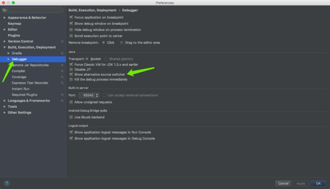 如果很不幸,就像我一样,没有显示这个提示,很可能某次调试过程禁用这个功能。不过也没关系,我们可以重新在设置 Preferences/Debuggers 重新打开该选项。如图所示: