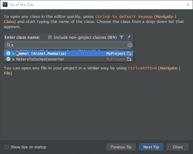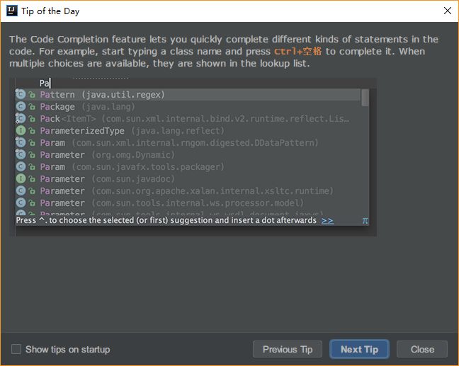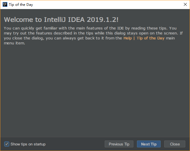 首先介绍的是 Tip of the day 。这个功能,大家应该都见过。初始安装好 IDEA,打开软件,默认就会弹出下面的窗口。