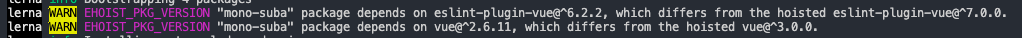 中独立为期安装依赖,并且在命令行中抛出警告。比如我在两个子项目中一个安装了 Vue2.6,另一个安装了 Vue3.0。