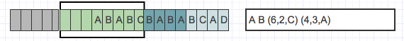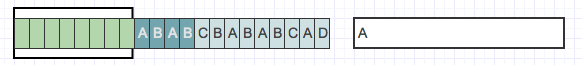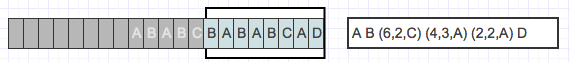 假如现在有一串字符 ABABCBABABCAD,设置缓冲区大小为 4,滑动窗口大小为 8 个字节。在初始时前四个字符 ABAB 进入缓冲区,滑动窗口为空,此时记录下一个字符 A