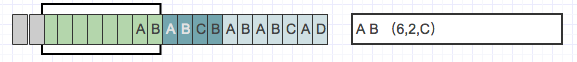 当窗口向右移动两个字符时,窗口内的AB和缓冲区的 AB 匹配,则进行标记替换,其中 6 表示 AB 在滑动窗口中的位置,2 表示匹配到的字符长度,C 为下一个字符。此时指针增加匹配长度 2