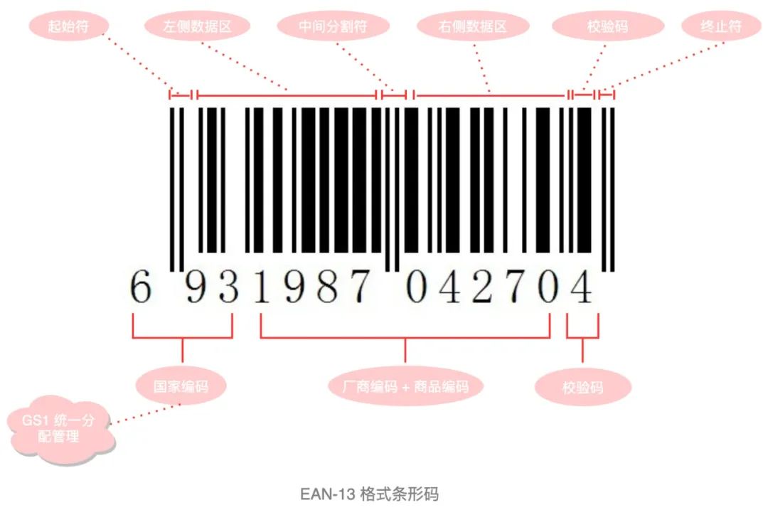 格式的,条形码数字编码的含义从左至右分别是前三位标识来源 国家编码(参考资料 1) ,比如中国为:690–699,后面的 4 ~ 8 位数字代表的是厂商公司代码,但是位数不是固定的,紧接着后面 的 9~12 位是商品编码,第 13 位是校验码,这就意味着公司编码越短,剩余可用于商品编码的位数也越多,可表示的商品也就越多,当然公司代码出售价格也相应更昂贵,另外用在商品上的 EAN-13