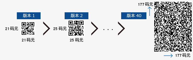 二维码的版本从 1 ~ 40 共 40 个不同的版本,每个版本的基本结构都是相同的,所不同的是每个版本的码元(构成二维码的方形黑白点)数量不同,从版本 1 (21 × 21 码元) 至版本 40 (177 × 177 码元) 依次递增。