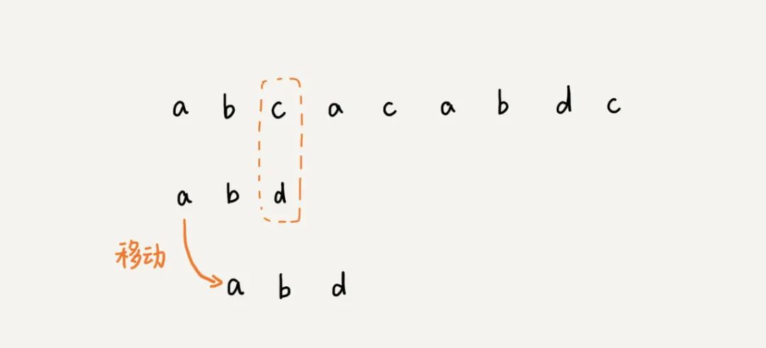 在上面的算法中,我们每碰到一个不匹配的字符,就把模式串往后移一位继续比较,而在一些场景中,如果不匹配的字符在模式串中不存在,即使是模式串往后移一位也依旧不会匹配,例如下面这种情况,只要有字符 c 在的地方,就不可能匹配,那么我们能不能把模式串往后多移几位,从而减少这种无意义的匹配呢?