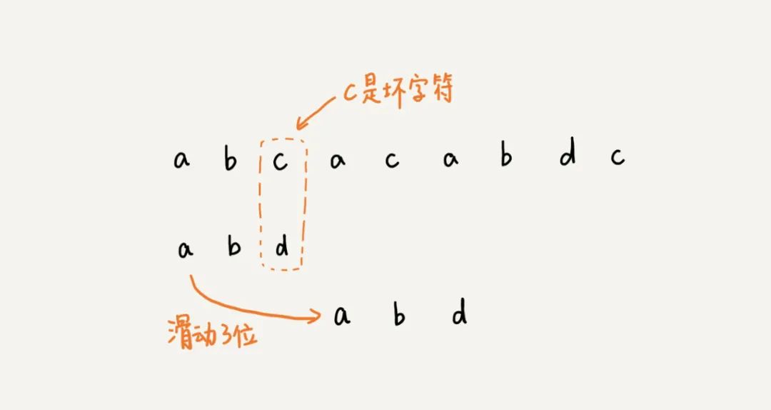当我们从模式串的末尾往前匹配时,发现某个主串的字符没法匹配,那么我们把主串的这个字符称之为坏字符,也就是字符 c ,然后我们再拿坏字符 c 在模式串中往前查找,如果没有找到这个字符,则可以断言有字符 c 的地方都不可能匹配,这次我们可以学聪明点,把模式串直接往后移 3 位再进行匹配。
