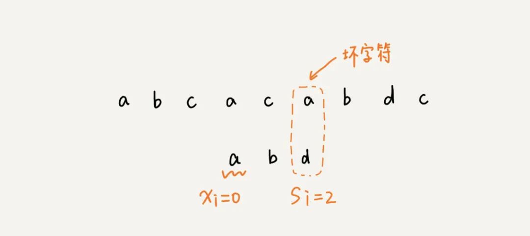 在了解了 BM 算法的基本原理后,我们该怎么实现这样一个算法呢,首先我们来实现一下坏字符规则,根据坏字符规则,当遇到坏字符时,要往后移动 si - xi 位,si 我们在匹配的过程中很容易得到,即坏字符对应模式串中的下标,而 xi 的计算才是重点,那么我们该如何求得 xi 呢?