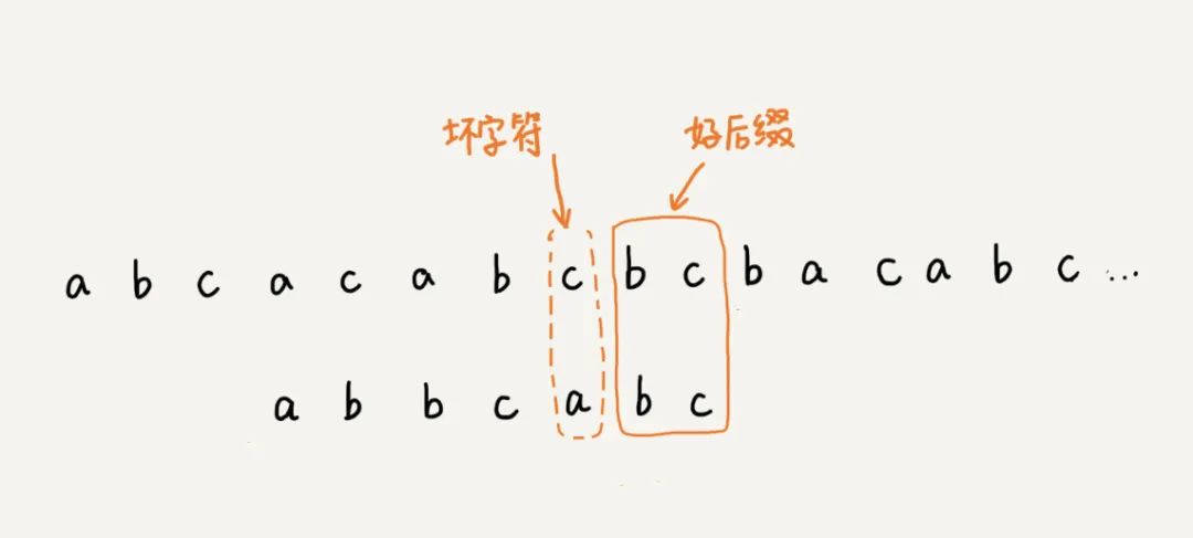 好后缀规则的思路和坏字符类似,在下面这种情况,当模式串移动到图中的位置的时候,模式串和主串有 2 个字符是匹配的,倒数第 3 个字符发生了不匹配的情况。我们把没匹配上的 c 称之为坏字符,而匹配上的字符 bc 称之为好后缀,这个时候如果我们用坏字符规则的话,可以得出后移的位数是 1,那有没有可以往后面再多移几位的办法呢,这种情况下我们就可以利用好后缀规则。