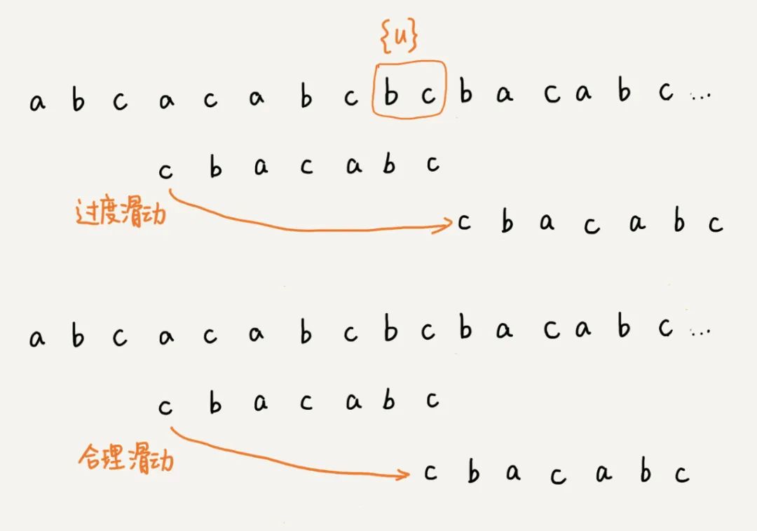 如果两条规则都没有找到可以匹配好后缀及其后缀子串的子串,我们就将整个模式串后移 m 位。