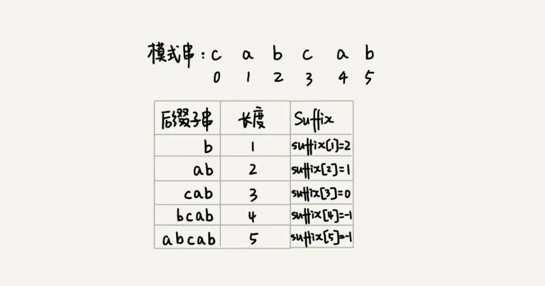 然后我们再引入最关键的变量 suffix 数组。suffix 数组的下标 k,表示后缀子串的长度,下标对应的数组值存储的是,在模式串中,除了后缀子串的部分,与该后缀子串相同的子串的起始下标,不存在就是 -1。例如后缀子串 ab,在模式串中从后往前再一次出现 ab 的 index 是 1,所以 suffix[2] = 1。