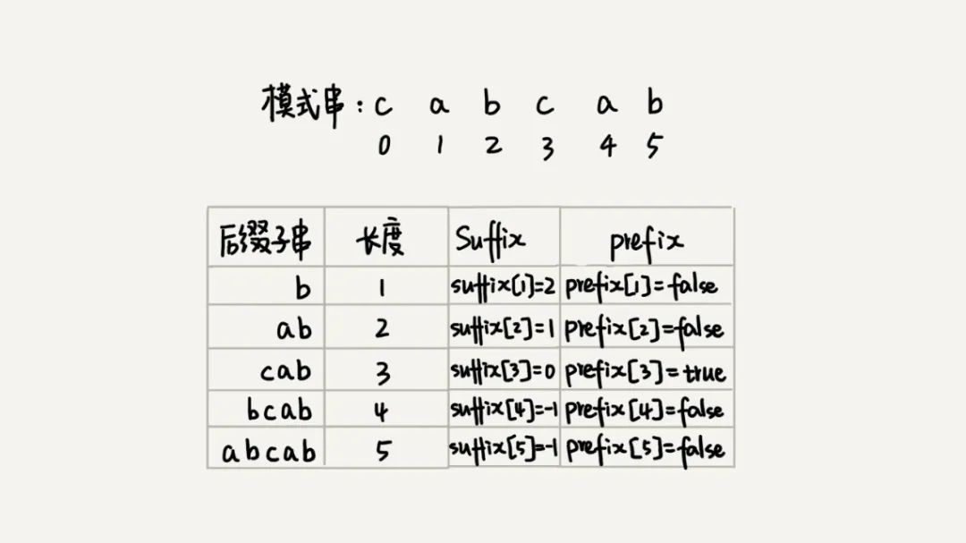 通过 suffix 数组,我们可以实现好后缀的第一条规则,但是并不能实现第二条规则,这时候我们需要再引入一个 boolean 类型的数组 prefix,用来记录模式串的后缀子串能否能匹配模式串的前缀子串。例如后缀子串 ab,模式串的前缀子串里面并没有 ab,所以 prefix[2] = false,而后缀子串 cab 刚好能和模式串的前缀子串 cab 匹配,所以 prefix[3] = true。