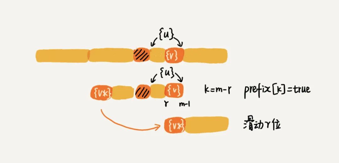 好后缀的后缀子串 b[r, m-1](其中,r 取值从 j + 2 到 m - 1)的长度 k = m - r,如果 prefix[k] 等于 true,表示长度为 k 的后缀子串,有可匹配的前缀子串,这样我们可以把模式串后移 r 位。