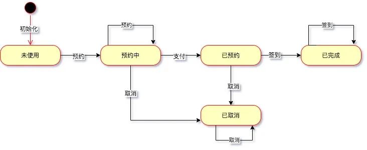 其中”已取消“和”已完成“都是最终态。“未使用” 状态的预约如果被预约则流转成 “预约中”状态,“预约中” 如果完成了支付可以流转成 “已预约”,“预约中” 和 “已预约” 状态 如果取消都会流转成“已取消”,“已预约”状态如果签到则流转成“已完成”。