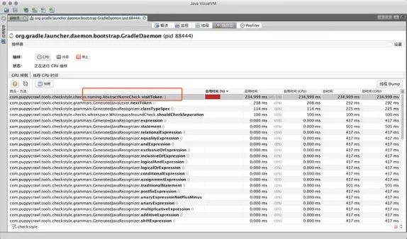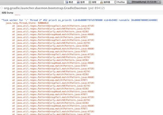 看看,哪个是我要找的进程,发现是 gradlew 的守护进程(我以为会单独开个进程),进去后一脸懵逼,看不出哪个是正真的工作线程,也没有死锁,此时又卡到 98% 了,决定采样来看看(图片有点模糊,因为是聊天记录上扒下来的,原图已过期):