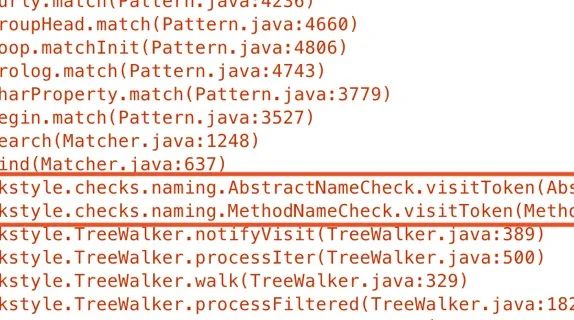 ,中文翻译:灾难性的回溯,我在本地执行了一下这个匹配确实要好几秒,再加上那么多测试方法,所以造成了卡住的现象。这个方法名根本不符合这个正则,这个正则不允许下划线分隔方法名,只允许出现在开头,为何最后能执行完成?这就是第二个坑了,该项目的测试方法上都是加上了@SuppressWarnings("checkstyle:methodname") 的,也就是不管你是否加上 suppress warning,它都是会执行的,它只会抑制警告(顾名思义),即:不针对这条检查返回错误。那么怎么去解决这个问题呢?方法有多种,一是把测试方法名改了,二是优化这个正则表达式,三是将 test 目录从 checkstyle 中排除掉(如果允许的话)一和三怎么看都像是在逃避问题,正则表达式确实是很多程序员的技术痛点,原因在于较高的学习成本(以及较低的使用频率),自己也是平常用到的时候翻翻文档,确实没太怎么关注正则语言(可用正则表达式表示的句子集合),作为一个喜欢研究上下文无关语言(如:我们的编程语言)的猛男,怎么可以被区区一个正则表达式击倒。