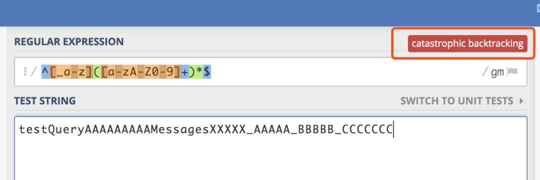 看到 regex 以及不断的 match,基本上可以推断出:这是正则表达式匹配时在疯狂回溯,这也解释了为何 cpu 占用会这么高;仔细翻调用栈,找到入口方法: