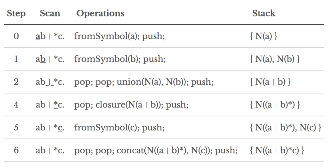Table nfa = NFAOp.toNFA(Expr.toPostfix(Expr.addConcatOperator(regx)));