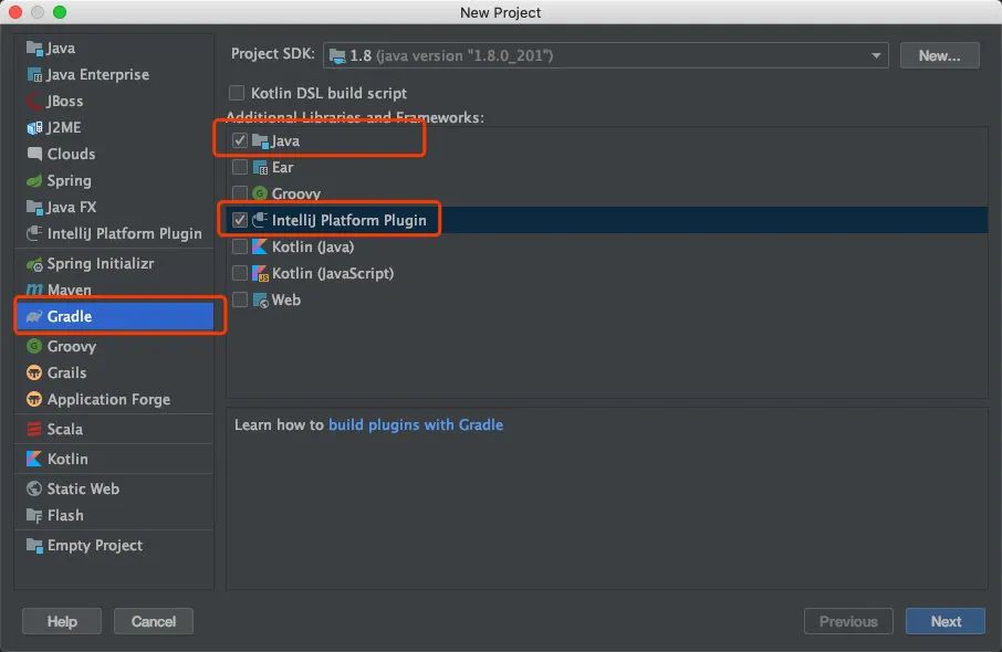 点击 File -> Project -> 选择 gradle -> 勾选上 Java 和 IntelliJ Platform Plugin 选项。